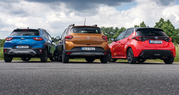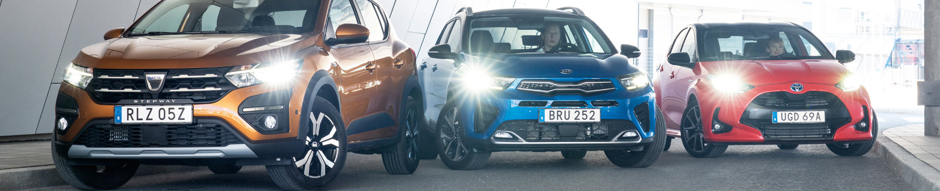 Dacia Sandero Stepway Comfort TCE 90, Kia Stonic 1,0 T-GDI Advance och Toyota Yaris 1,5 Hybrid Active